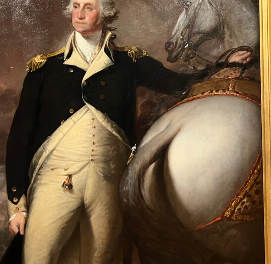 Here’s what I notice: the rear-end of the horse is big and white; the horse’s eye is wide open and his nostrils are flaring; the bit is deep in his mouth. Washington’s pose is relaxed and confident and his left hand is barely holding the reins. The horse’s tail falls parallel to a locket from Washington’s pocket. Washington’s penis is visible, or, as a friend put it, he has “camel toe.” Others might refer to it as the penile line.
